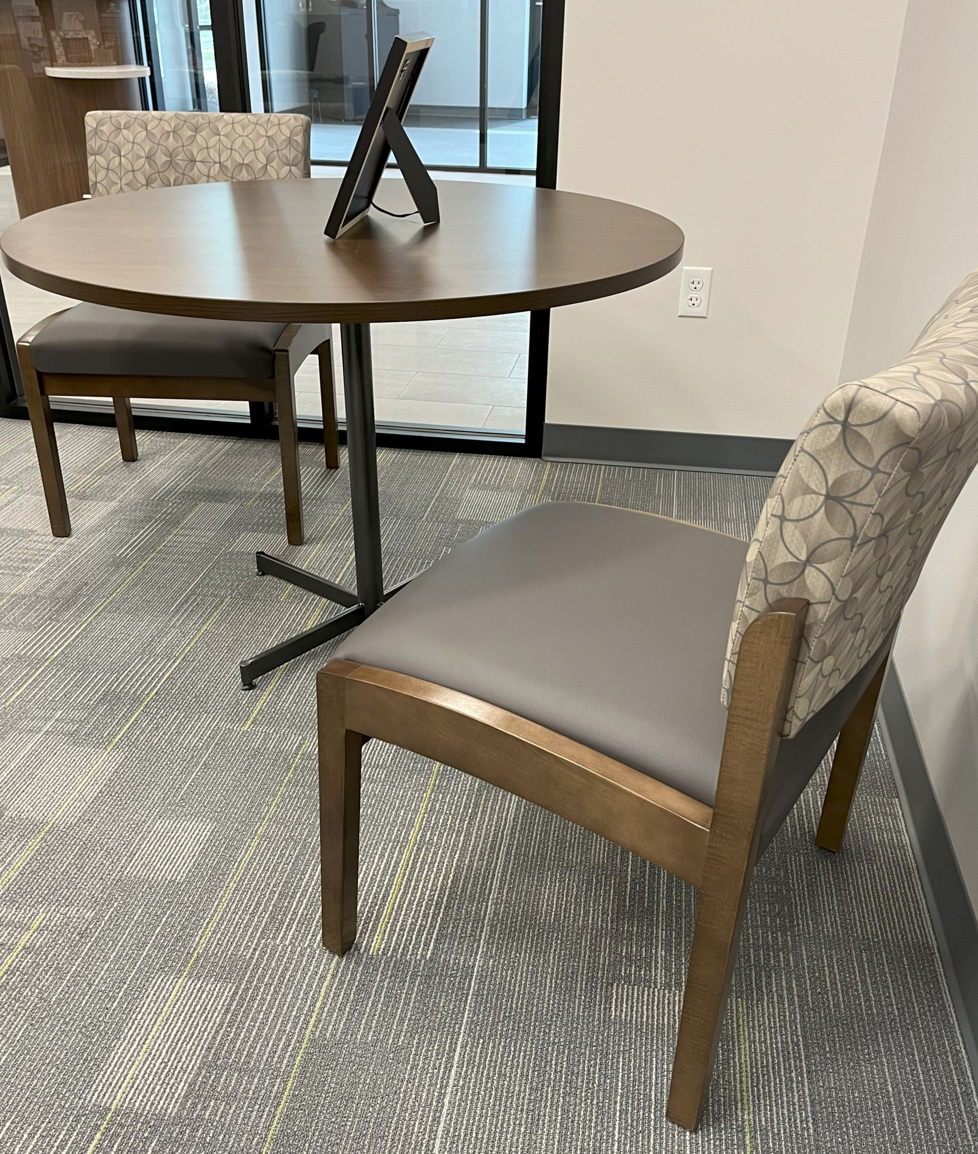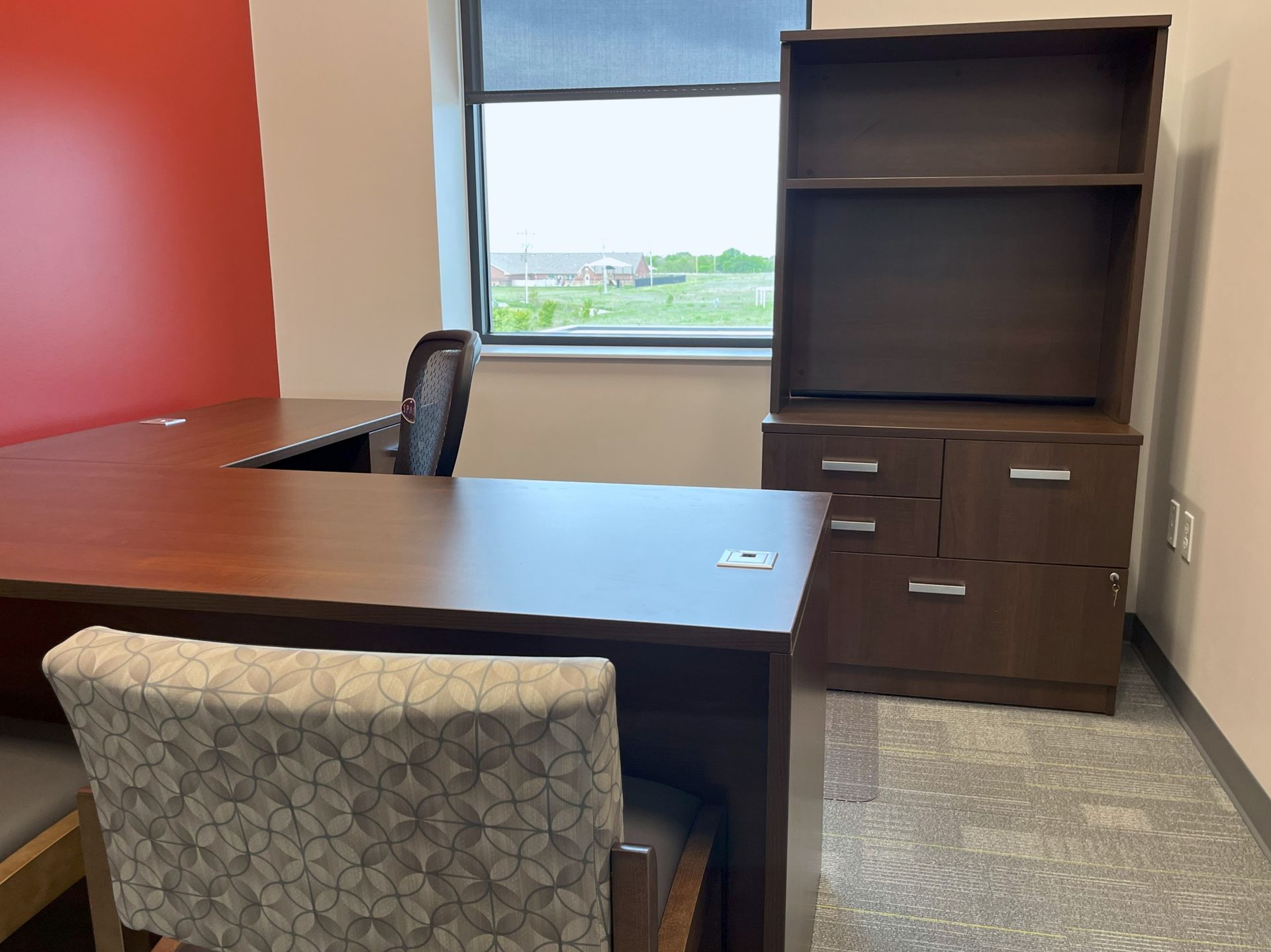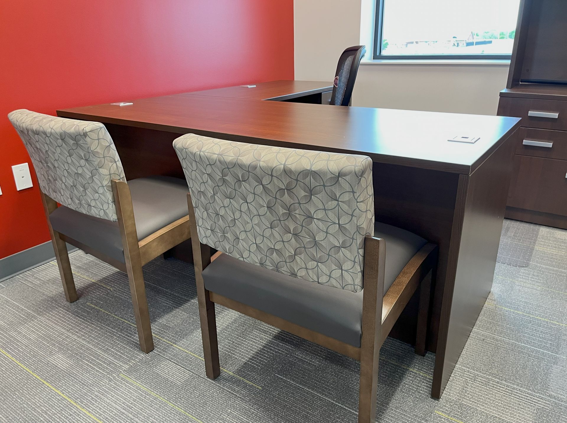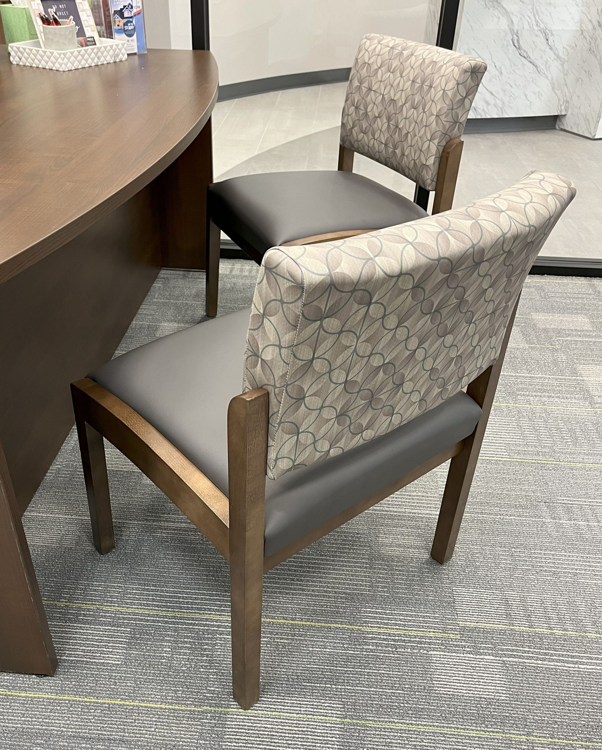 Classic wood tones, contemporary fabrics, and timeless furniture combine to create a sophisticated yet functional corporate office for this regional credit union.